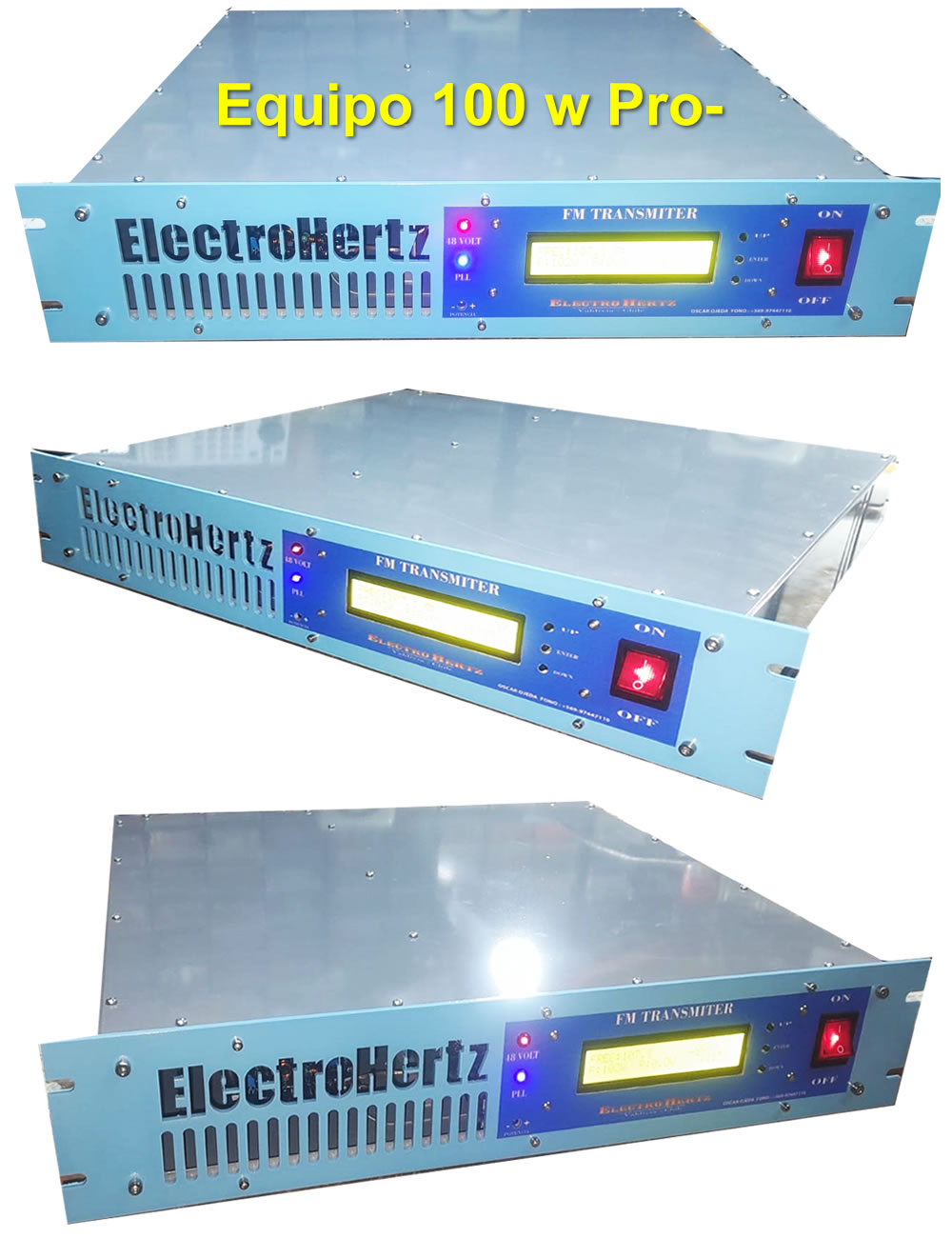 El transmisor con el amplificador 100 de FM. Este equipo incorpora el módulo amplificador de RF de alta eficiencia 100 watts, filtro pasabajos, así como protecciones cíclicas de SWR, , sobrepotencia y temperatura. La potencia es regulable de 0 a 100W. Su fuente de poder permite que el equipo mantenga la potencia nominal de salida con variación de voltaje de 220 AC.